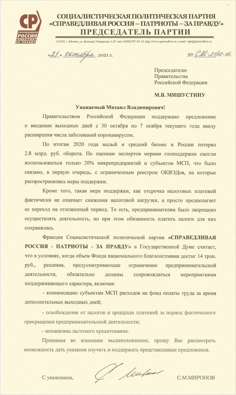 см. также ↓Председатель Партии СПРАВЕДЛИВАЯ РОССИЯ – ЗА ПРАВДУ, руководитель партийной фракции в Госдуме Сергей Миронов обратился к Председателю Правительства Михаилу Мишустину с предложением о поддержке предпринимателей в связи с выходными днями с 30 октября по 7 ноября текущего года, объявленными из-за роста числа заболеваний коронавирусом.