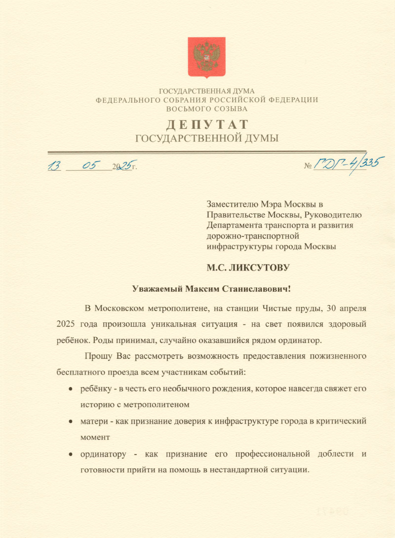 Первый заместитель руководителя фракции "СРЗП" в Госдуме Дмитрий Гусев вручил Благодарственное письмо ГД ординатору Марии Блажко, которая приняла роды у женщины прямо в метро. Также депутат предложил обеспечить пожизненный бесплатный проезд в столичной подземке для малыша, его мамы и молодого врача. Парламентарий обратился к главе Департамента транспорта и развития дорожно-транспортной инфраструктуры Москвы Максиму Ликсутову с такой инициативой.