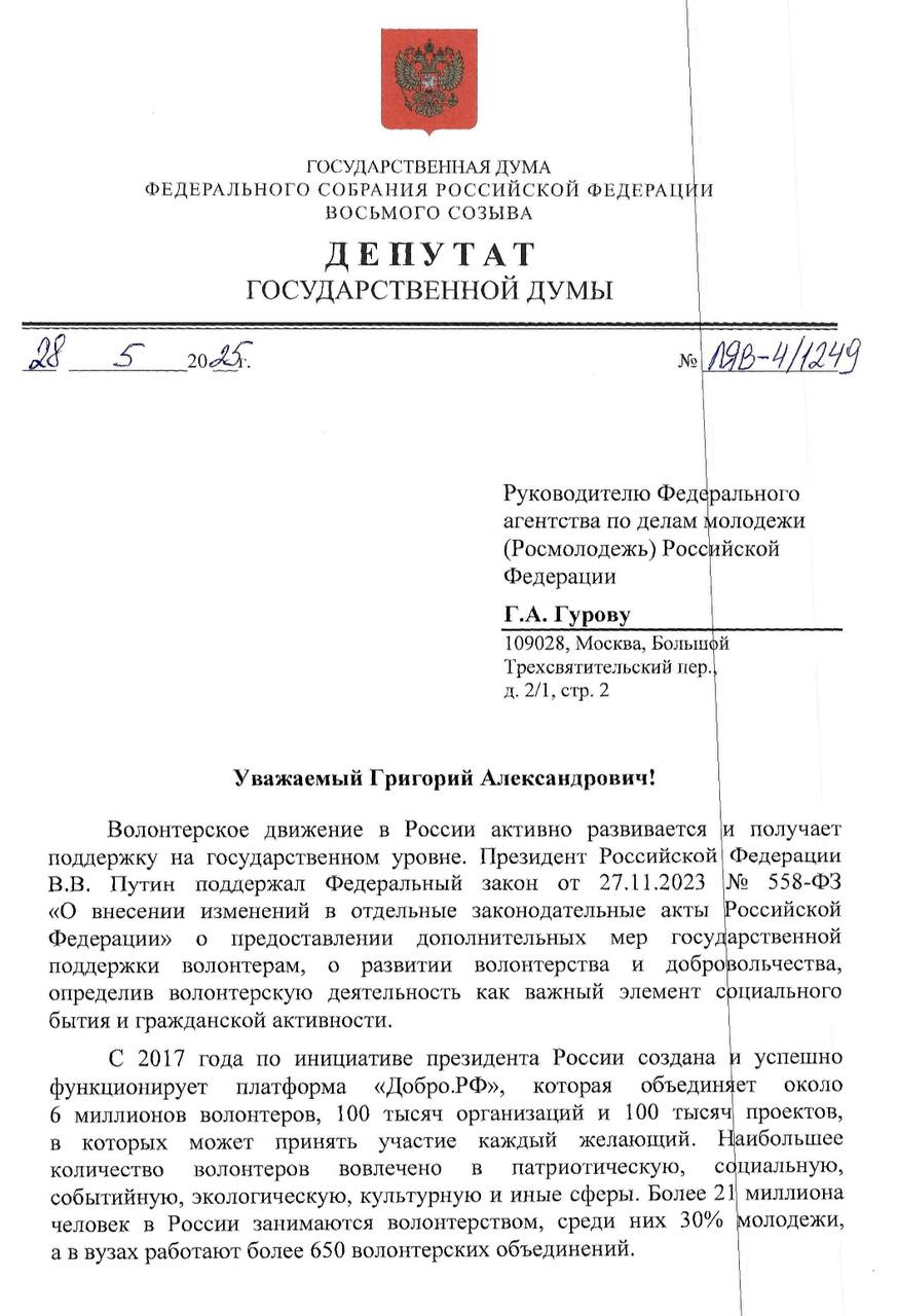 Первый заместитель руководителя фракции "СПРАВЕДЛИВАЯ РОССИЯ – ЗА ПРАВДУ" в Госдуме Яна Лантратова направила письмо главе Росмолодёжи Григорию Гурову с предложением расширить региональный функционал платформы "Добро.рф".