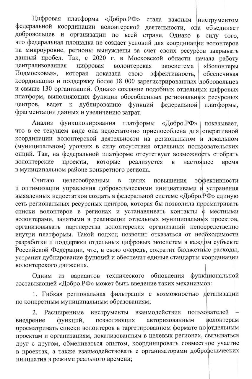 "Предлагаю создать в федеральной системе "Добро.рф" единую сеть региональных ресурсных центров, которая бы позволила просматривать списки волонтёров в регионах и устанавливать контакты с местными волонтёрами, занятыми в реализации отдельных муниципальных проектов, организовывать партнёрства волонтёрских организаций непосредственно внутри платформы", – пояснила Яна Лантратова.