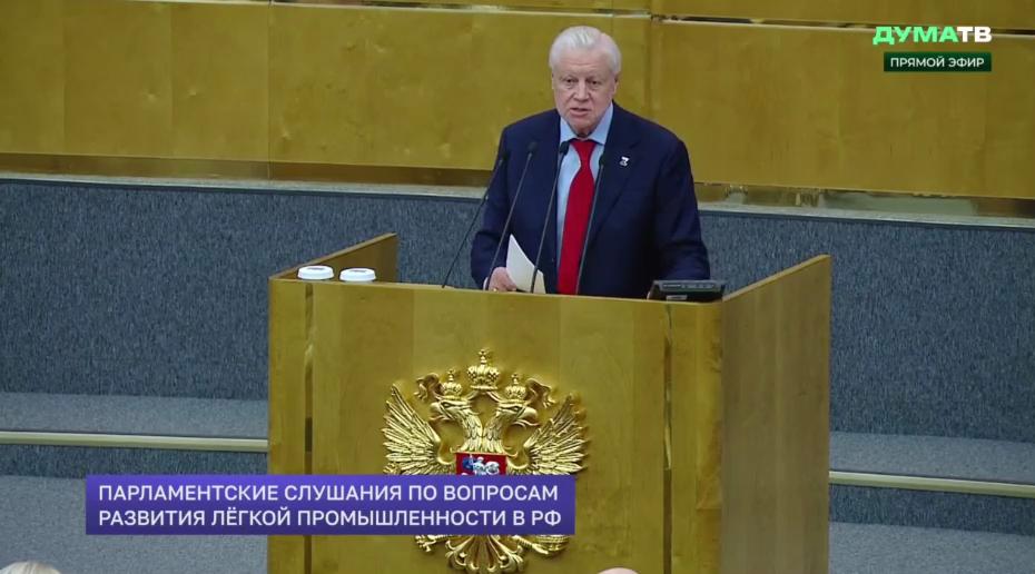 Председатель Партии СПРАВЕДЛИВАЯ РОССИЯ, руководитель партийной фракции в Госдуме Сергей Миронов выступил на парламентских слушаниях по вопросам развития лёгкой промышленности в РФ, которые состоялись в ГД 29 января.